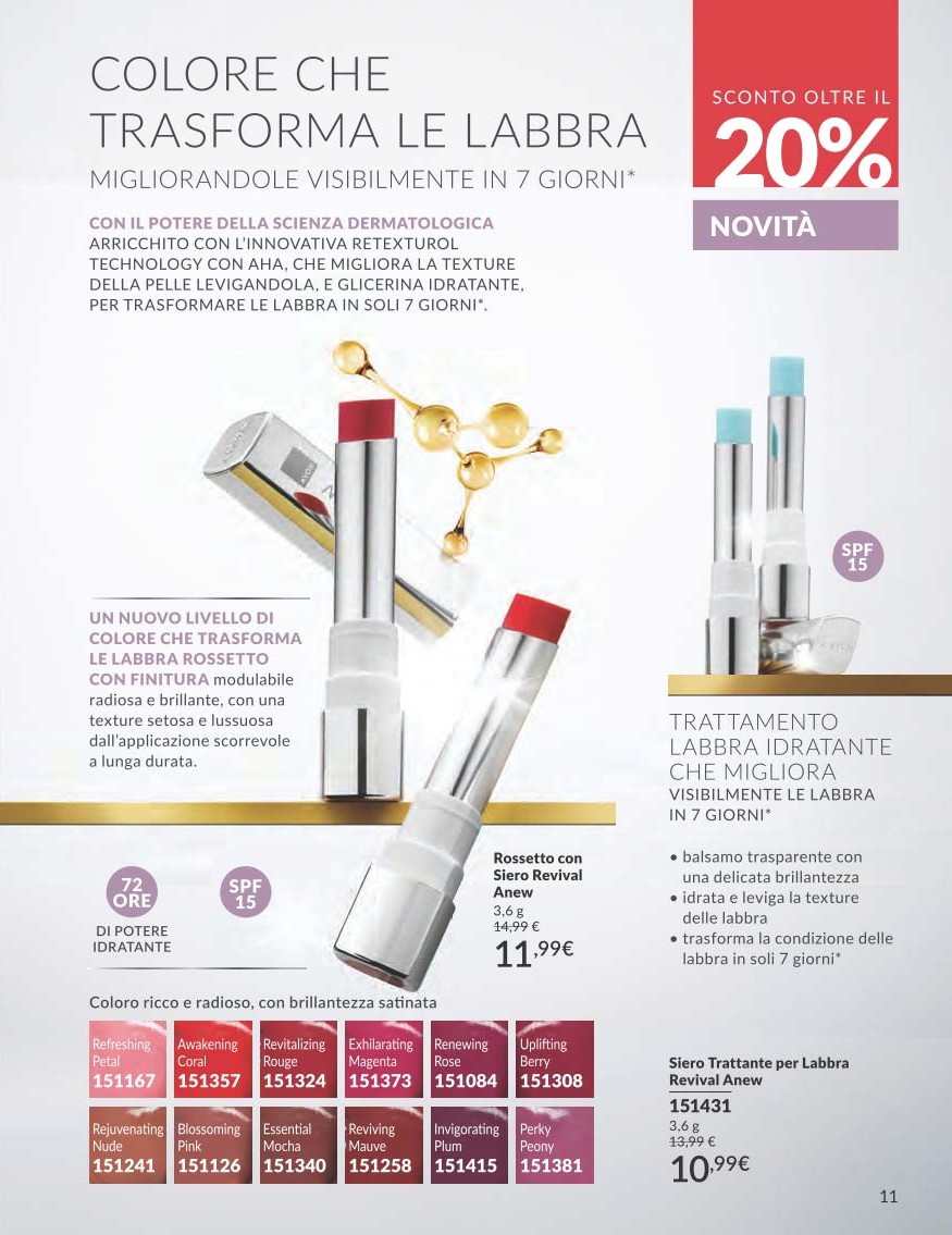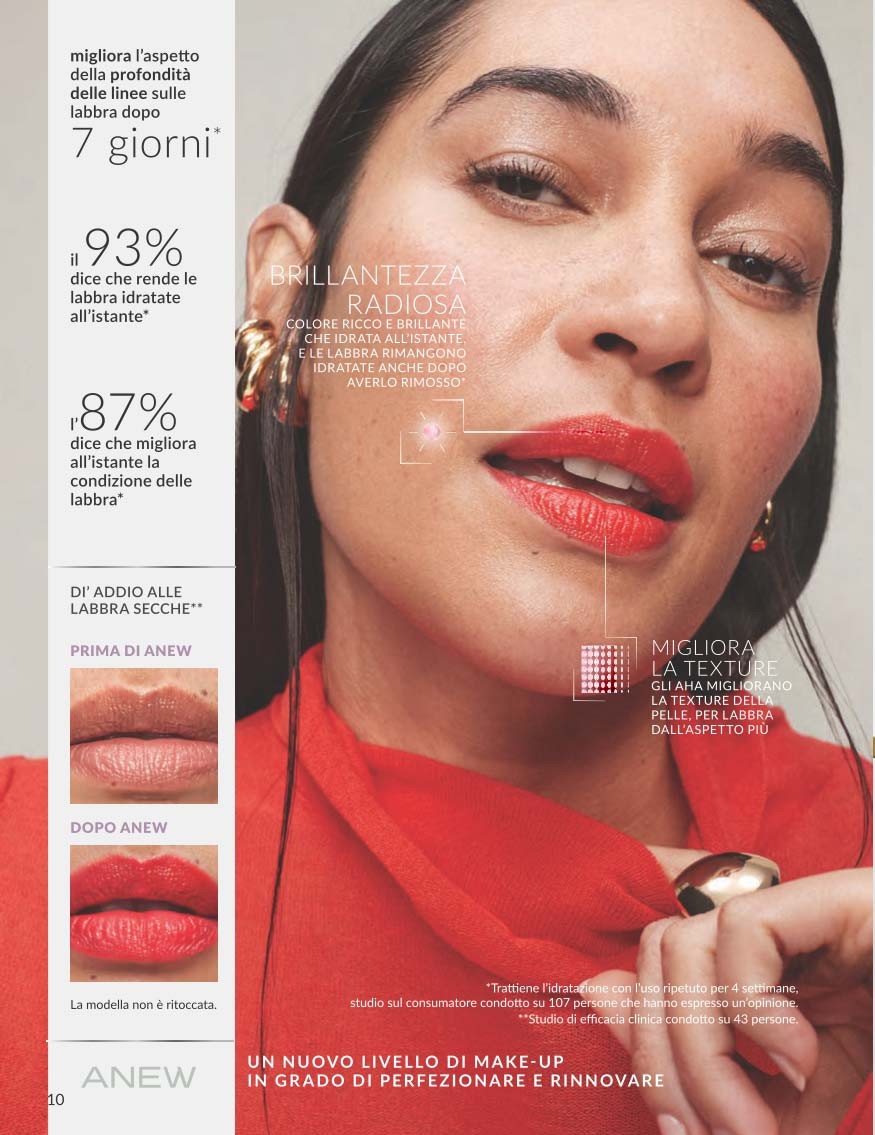 Il nuovo Rossetto con Siero Revival Anew è la risposta di Avon per chi cerca un make-up che sia anche trattamento. Grazie alla Retexturol Technology con AHA e glicerina idratante, il rossetto leviga e idrata le labbra, migliorandone la texture visibilmente in una sola settimana.
