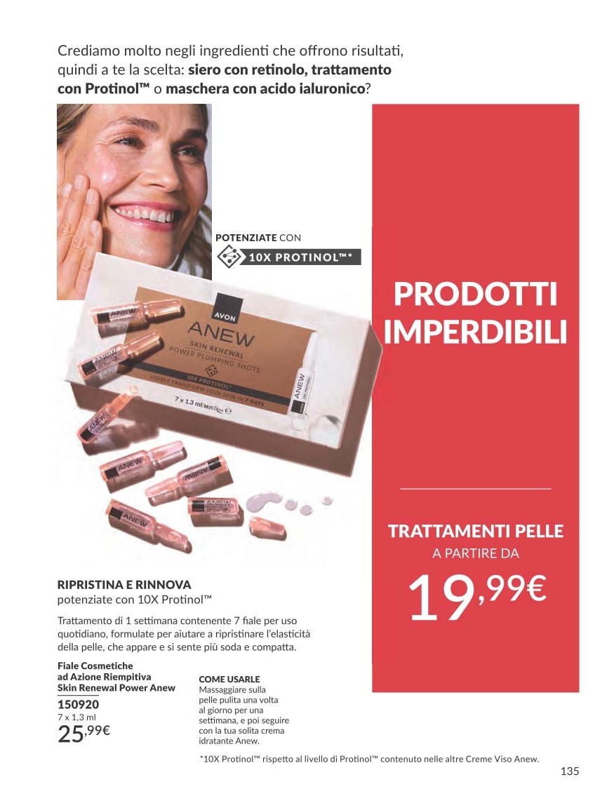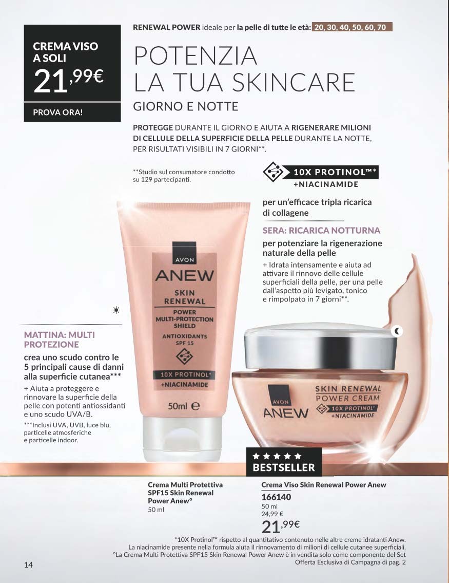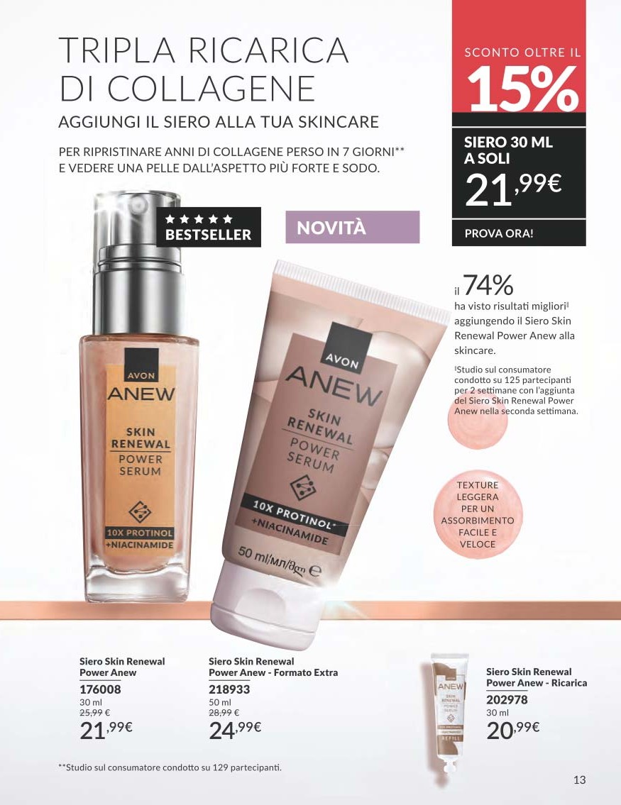 Il Siero Skin Renewal Power Anew è uno dei bestseller più amati, e torna nel Catalogo Avon 10 2025 Ottobre con nuove offerte. Formulato con 10x Protinol™ e Niacinamide, agisce in soli sette giorni per ripristinare la densità della pelle e migliorarne la compattezza.