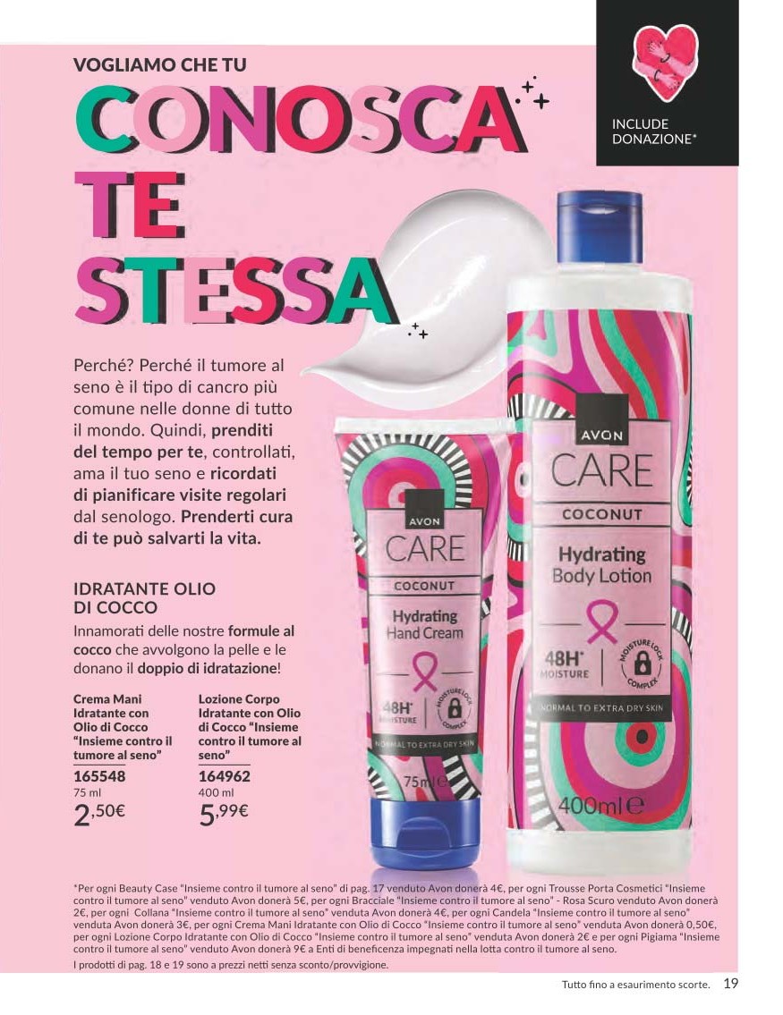 Con l’acquisto dei prodotti Avon Care Coconut – Crema Mani e Lozione Corpo, parte del ricavato viene devoluta alla ricerca. Le formule, arricchite con olio di cocco idratante, offrono 48 ore di nutrimento e sostegno concreto a una causa importante.
