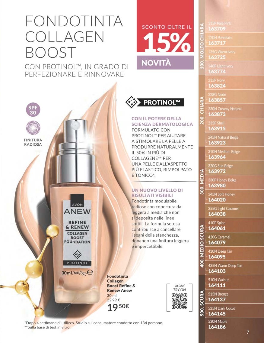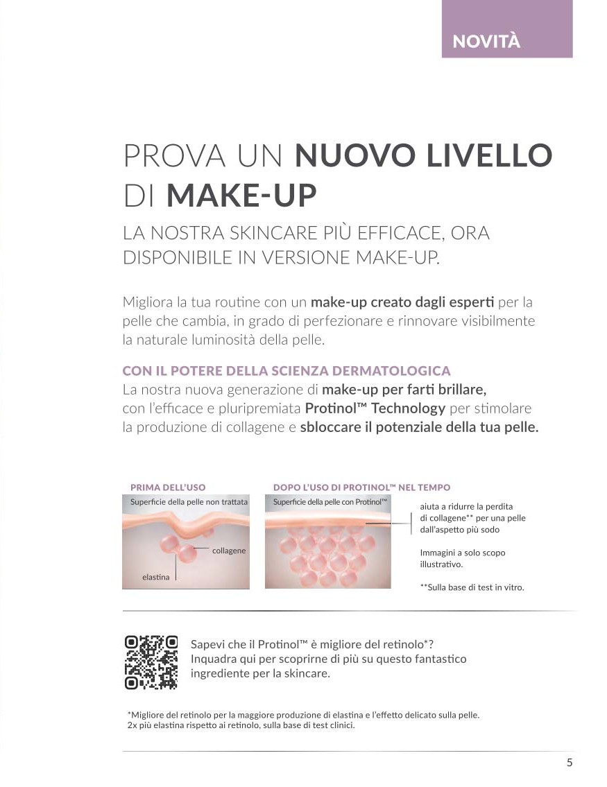 - Fondotinta Collagen Boost (30 ml, SPF 30): arricchito con Protinol™, stimola la produzione naturale di collagene fino al 50% in più, donando alla pelle un aspetto più elastico e compatto. Offre una copertura modulabile e una finitura radiosa, ideale per un incarnato luminoso e uniforme.